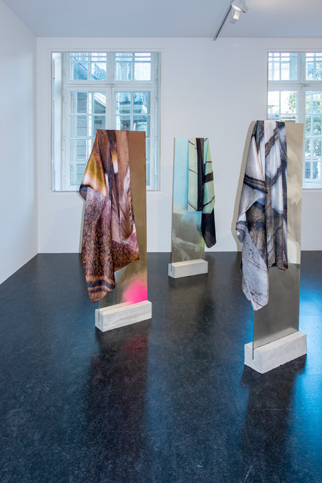 Hoch aufgelöste Scans von Schmetterlingsflügeln sind auf Seide gedruckt und auf Spiegelstelen drapiert. Jeweils ein Paar verdeckt partiell das Spiegelbild. DieInstallation nimmt die imWerk des Künstlerduoshuber.huber widerkehrendenThemen derMetamorphoseund der Seele auf. Spiegel sind in verschiedenen Kulturen ein zwiespältiges Symbol, das einerseits für Eitelkeit und Wollust, andererseits für Selbsterkenntnis und Weisheit steht. Spiegel vermischen die Erfahrung von Innenleben und äusserer Erscheinung, von Selbst und Anderem. In manchen Mythologien galt der Spiegel als Abbild der Seele einer Person, die auch eingefangen und festgehalten werden konnte. Die Seide der 180 Zentimeter langen Schals entsteht aus den bis zu 900 Meter langen Fäden des Kokons des Maulbeerspinners. In Seide kann sich der Mensch einhüllen und so wie einst der Schmetterling mit seinen prächtigen Farben täuschen, tarnen oder warnen.Sowohl Spiegelals auch Seide konstruieren Identitäten, lassen sie aber gleichzeitig instabil erscheinen.