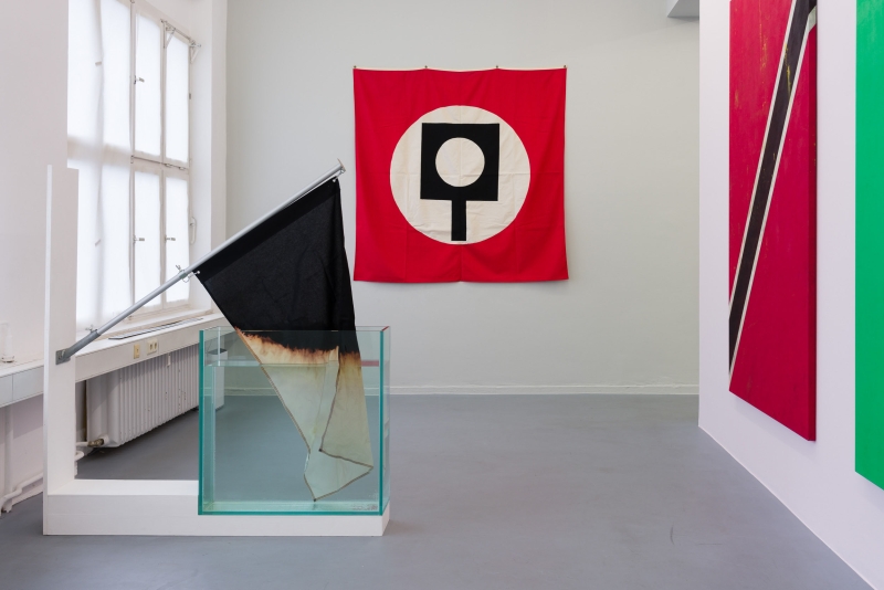 Picture a modern battlefield ravaged by military vehicles, littered with shrapnel, and abandoned by the last surviving men. Above it a lonely flag flutters in an open sky – an ambivalent sign of peace and destruction. Although it is unknown how and when it came about, a flag is the most established signalling device of humankind. It can be a promise of goodwill or an omen of ruin. Now imagine all the flags that shimmered over thousands of years… Some are now torn to pieces, others yet to be woven. Their colours blend creating an inexhaustible palette enriched by blood, sweat and tears. Not too far from today's military warfare, the group show FLAG at Galerie Elisabeth & Reinhard Hauff takes up the flag as its central motif. Different in their patterns and delivery the flags exhibited tell stories of consuming powers, suggestive politics, and ironic encounters.