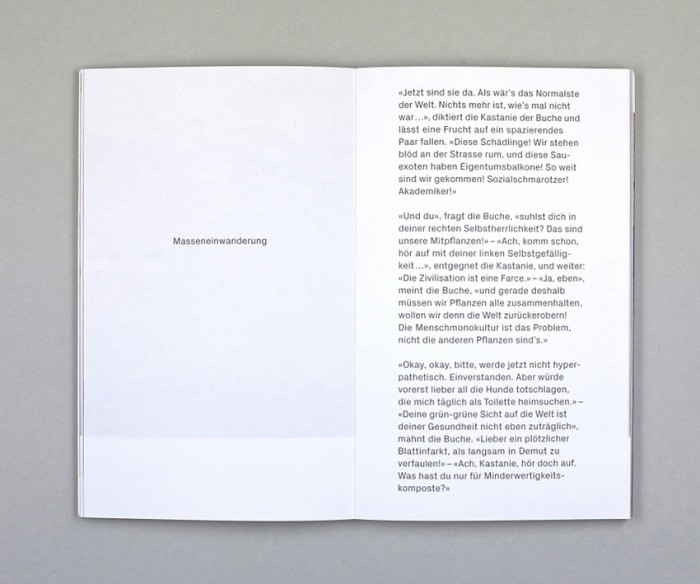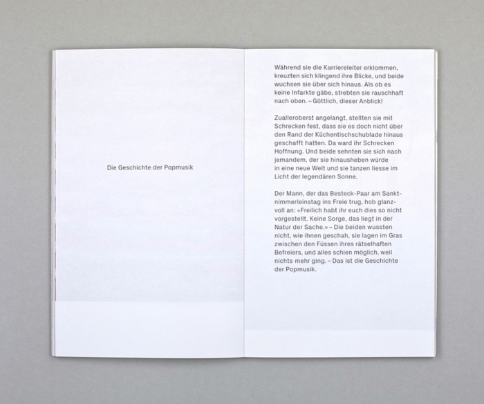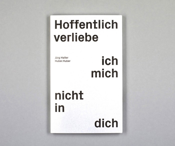 Hoffentlich verliebe ich mich nicht in dich (“I hope I don’t fall in love with you”) is a project by the Zurich artist duo Huber.Huber — i.e. twin brothers Markus and Reto Huber — and Bern poet Jürg Halter. The two artists and the author have set their sights on uncovering unusual sides of ordinary goings-on in public space. Artists Huber.Huber took pictures at regular intervals, which poet Jürg Halter then worked into poetic and absurdly humorous vignettes about the photographs.