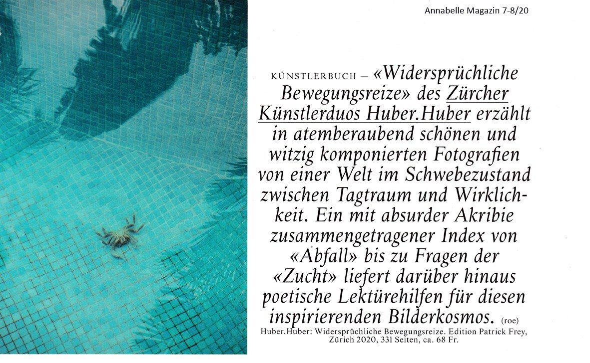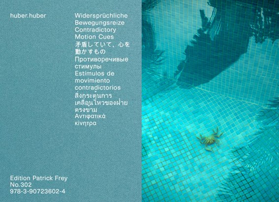 Das Künstlerbuch Widersprüchliche Bewegungsreize schliesst an die Publikation Universen (Edition Patrick Frey, 2011) an und macht das künstlerische Schaffen der letzten 10 Jahre in Form eines Künstlerbuchs sicht- und greifbar. Die Bildleser werden wiederum in einen wunderbar wuchernden Bilderkosmos entführt. Anders als in Universen sind nicht Collagen und Tuschezeichnungen bestimmende Bildträger, sondern der Fokus liegt ganz auf den Fotografien von huber.huber. Zu Doppelseiten komponiert bilden sie auf- und abtauchende, längere und kürzere Sequenzen, in den sich weitere Arbeiten in anderen Techniken verweben. Der schillernde Bilderteppich löst durchaus widersprüchliche Bewegungsreize aus und führt im Extremfall zu den gleichen Symptomen wie bei Reisekrankheit. Kurze Texteinträge (die in insgesamt 7 Sprachen übersetzt werden), die zwischen lapidaren Beschreibungen und assoziativen Sinneseindrücken oszillieren, bilden einen Schlüssel zu manchen Bildern oder Werkgruppen und fungieren gleichzeitig als wohltuende Pausen. Ein ungewöhnlich ausschweifender Index macht mit seinen einfachen Ding- und Eigenschaftsworten (Apfel, Petrischale, Salzsee oder feucht, geometrisch, unheimlich) den Bilderkosmos lesbar.